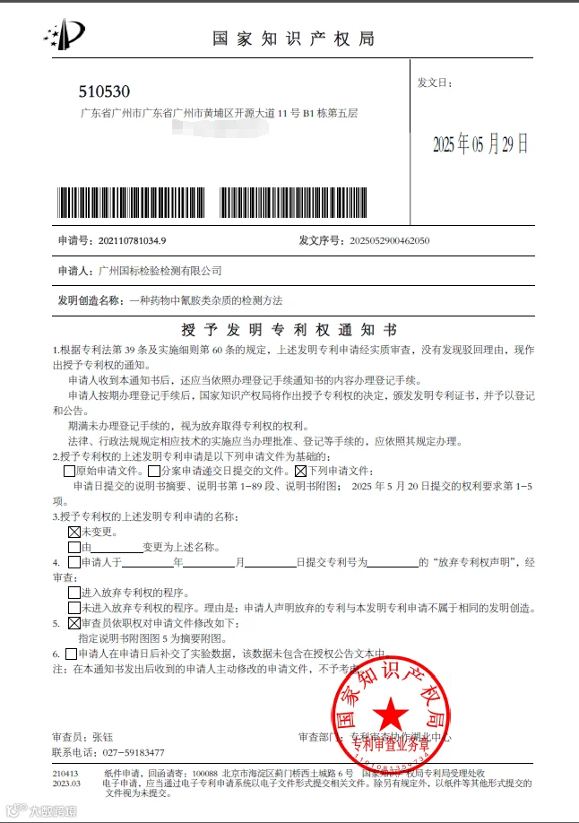 5月29日,公司申请的发明专利“一种药物中氰胶类杂质的检测方法”被国家知识产权局授予发明专利权。点击阅读原文