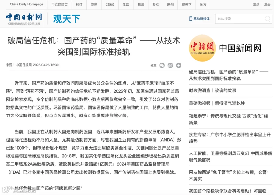近年来,国产药的质量和疗效问题屡屡成为公众关注的焦点。从“麻药不麻”到“血压不降”,再到“泻药不泻”,国产仿制药的信任危机不断发酵。2025年初,某医生通过国家药监局网站检索发现,多个仿制药品种的临床数据小数点后两位竟完全一致,引发了公众对仿制药数据真实性的广泛质疑。尽管国家药监局、国家医保局做了大量细致的工作,花费大量的精力为公众解疑释惑,但点点火星溅出,就有可能发展成熊熊火势。