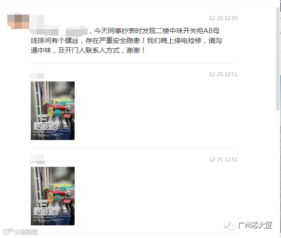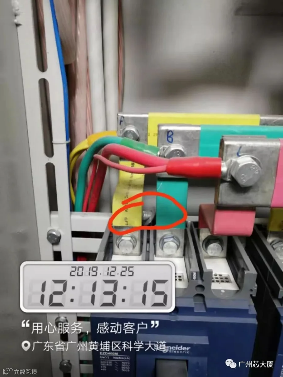 2019年12月25日,已是年末将近,芯大厦园区内显得格外忙碌。中午12点左右,园区综合服务商乐飞物业工程人员庞工像往常一样,按照工作指引手册,对芯大厦各楼层配电柜及相关设备进行巡捡。在对2楼租户中味餐饮仓库配电柜进行抄表检查时,细致、认真的庞工,一眼就发现开关柜AB母线排间有个小螺丝,这个状况是存在严重安全隐患的。庞工当即向上级以及客服部反映情况,与租户沟通联系,安排停电取出螺丝并进行安全排查,因涉及到厨房设备用电问题,为了不影响租户的正常营业,只能选择在晚上进行作业。