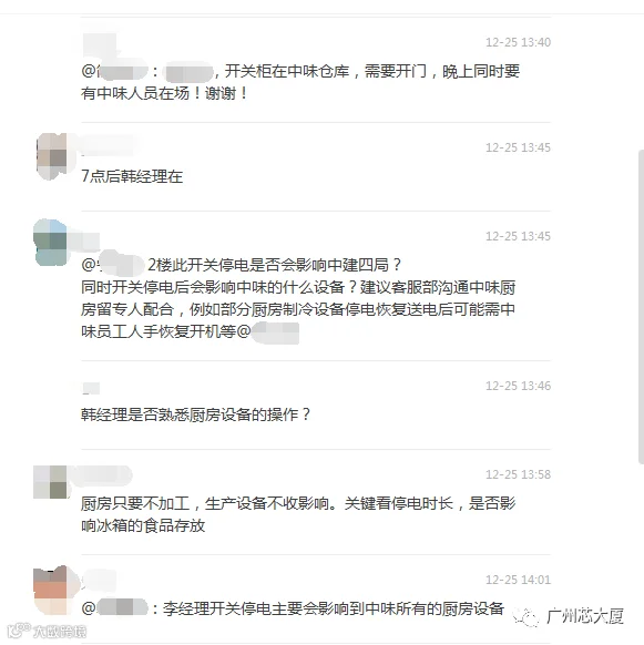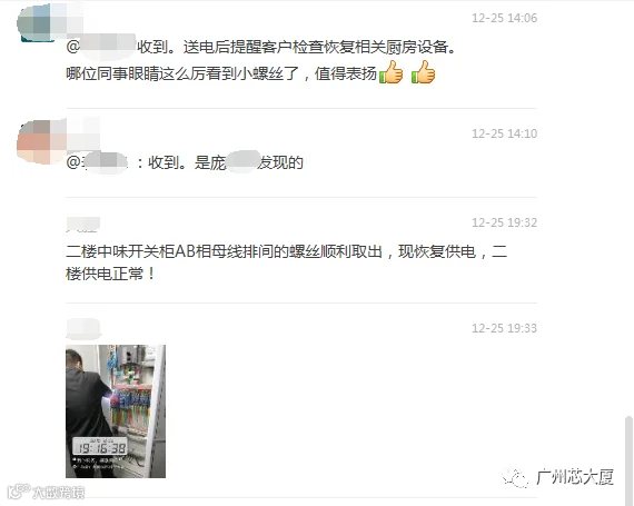 工程部提前制定完善、有效的方案,统筹规划,合理安排部署,在租户大力配合下,傍晚19点,庞工和同事们一起,凭着他们的专业与细致,很快将配电柜中的小螺丝取出,并对整个配电柜进行安全排查,在确认安全后,及时送点,之后及时提醒客户检查和恢复相关厨房设备。庞工和他的同事们,用他们的细心、专注与专业,用心服务,在自己的岗位上默默耕耘,安全守护在租户的身边,保障着园区的设备设施安全。