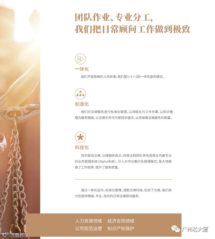 岭南法顾系广东岭南律师事务所专业法律服务团队,以为企事业单位、国家机关提供常年法律顾问和专项法律顾问服务为主要业务方向,追求“更专业、更实用、更及时”,打破“问而顾,不问不顾”的传统做法,采取集约化法律顾问服务模式。我们专业分工,团队作业,为客户提供全方位的精细服务。我们以解决问题为中心,以知识标准化为依托,运用法律科技,实现客户法律需求目标。我们引导客户合规运营、规范管理,防范法律风险,助力客户事业发展。