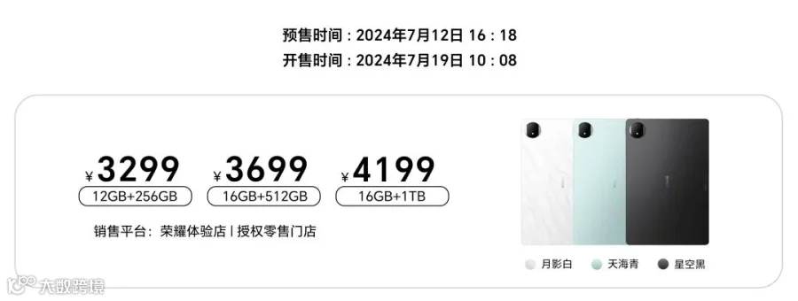 本次荣耀平板MagicPad2共有月影白、天海青、星空黑三款配色可选,其中12GB+256GB版本售价3299元、16GB+512GB版本售价3699元、16GB+1TB版本售价4199元。
