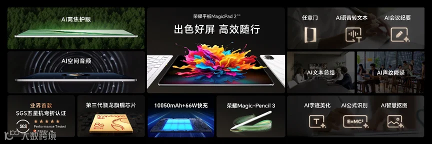荣耀终端有限公司CEO赵明表示:“荣耀平板MagicPad2以AI使能硬件,屏幕护眼&空间音频以及芯片体验。以AI使能软件,带来学习办公新体验,成为荣耀平板的巅峰之作。”