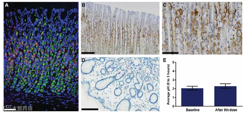 图1 GLP-1抑制剂在大鼠和人体胃粘膜中的表达以及人体的胃pH值。(A)GLP-1R mRNA(红色信号,RNA范围 ISH)在大鼠胃粘膜顶叶细胞中(绿色信号,ATP酶的IHC,顶叶细胞的标志物)。比例尺,50μm;(B和C)大鼠胃粘膜中顶叶细胞的GLP-1R(棕色)膜相关染色。比例尺,100μm和50μm(分别为B和C);(D)GLP-1R mRNA(蓝色)在人体胃中的表达。比例尺,100μm;(E)健康个体(n=28)在基线和第九剂口服司美格鲁肽后3小时内的平均pH值。在ANOVA模型中分析,基线和第9天之间的胃pH值没有差异,对数转换的3小时平均pH值作为因变量,参与者和第9天(基线或第9天)作为固定效应,误差条显示95%CI。