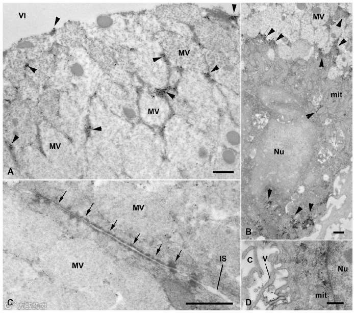 司美格鲁肽主要集中在表面粘液的细胞内。对大鼠口服司美格鲁肽后胃粘膜的电子显微镜(EM)研究显示,司美格鲁肽在粘膜的浅表和颈部区域有信号,通过表面粘膜上皮细胞中的强烈标记,在粘膜的表层最明显。在这些细胞中,在粘液囊泡之间的细胞质中观察到强大的免疫反应性,尽管粘液囊泡本身仍然没有标记。免疫反应性在粘液细胞的基底细胞质中也很明显,表明司美格鲁肽是跨细胞转运。粘液分泌细胞的顶端部分之间的连接复合体是完整的,这突出了不存在细胞旁定向吸收。在连接复合体下的粘液细胞之间的细胞外空间中不存在免疫反应性,进一步证实跨细胞吸收模式。在胃腺的颈部区域,在细胞质和壁细胞的细胞内小管微绒毛上观察到银色颗粒。