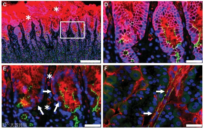 图9 (C)3F15(红色)、β-连环蛋白(紫色)、ZO1(绿色)和DAPI(蓝色)。上皮最上部区域的变慢以白色星号为标志;司美格鲁肽也在较深、完整的层中检测到(白盒)。比例尺,200μm;(D)(C)中方框区域的放大倍数更高。与管腔司美格鲁肽直接接触的顶端ZO1(绿色)标记的完整紧密连接。比例尺,40μm;(E)与不含β-连环蛋白的(D)区域相同。在粘膜细胞中观察到细胞内3F15反应性(红色)(用白色箭头标记)。3F15还可检测上皮下毛细血管(白色星号标记)中的司美格鲁肽。比例尺,40μm;(F)63×共焦11μm的最大投影图像z堆栈,显示与标记有平滑肌肌动蛋白(绿色)的血管(由白色箭头标记)相关的司美格鲁肽(红色)。比例尺,40μm