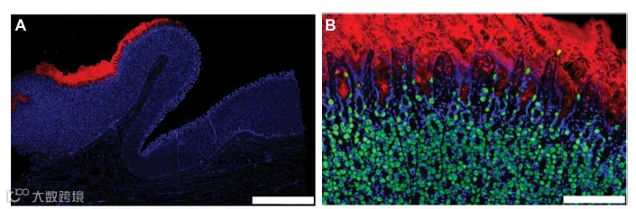 图8 (A)片剂下方局部3F15(司美格鲁肽)免疫荧光反应性(红色)。细胞核用4′,6-二脒基-2-苯基吲哚(DAPI;蓝色)复染。比例尺,2mm;(B)3F15反应性(红色)仅限于颈部区域。大部分H+/K+ATP酶(绿色)阳性顶叶细胞位于较深的层中,但在暴露于管腔司美格鲁肽的颈部区域可以发现一些分散的顶叶细胞。比例尺,200μm