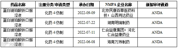 ▲ 表2 蛋白琥珀酸铁口服溶液新4类仿制申报情况