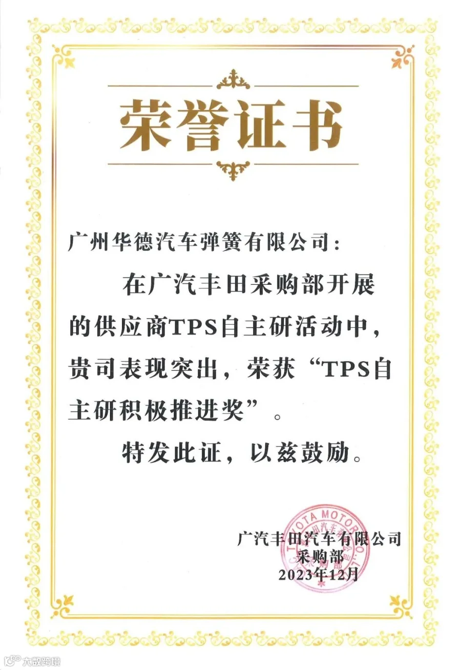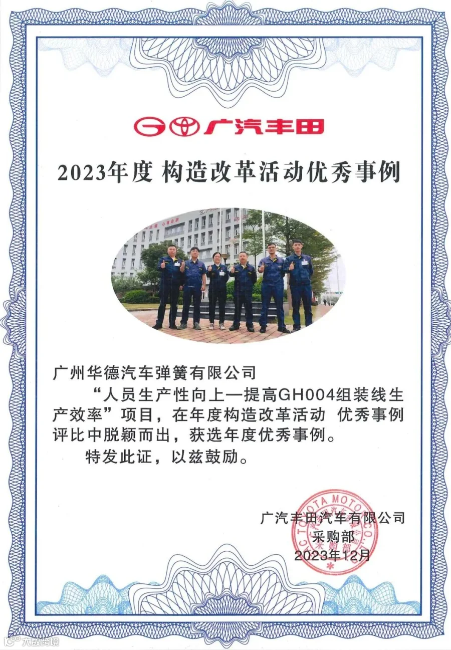 近日,在广汽丰田丰彩会年终总结会上,广州华德《提高GH004组装线生产效率》项目,凭实力从20多个参赛改善案例中脱颖而出,荣获“TPS自主研积极推进奖”、“2023年构造改革活动优秀事例奖”。