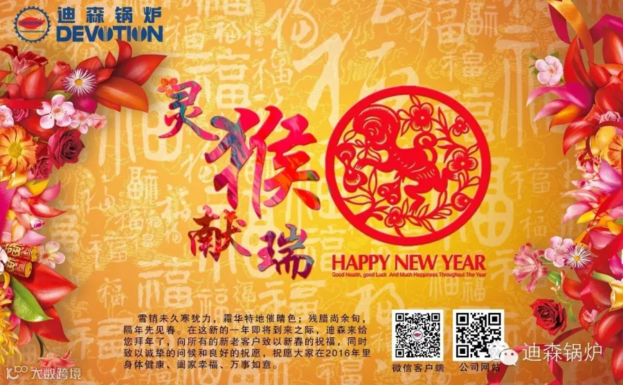 2015将成为历史,2016年的钟声将要敲响,新的一年即将到来,万物复苏,生机勃勃,昭示更美好的发展前景,借此机会,广州迪森热能设备有限公司全体员工向所有的新老客户致以新春的祝福,同时致以诚挚的问候和良好的祝愿,祝愿大家在2016年里身体健康、阖家幸福、万事如意,愿在新的一年里,迪森与您携手合作,同心、同力、同行,再创辉煌。