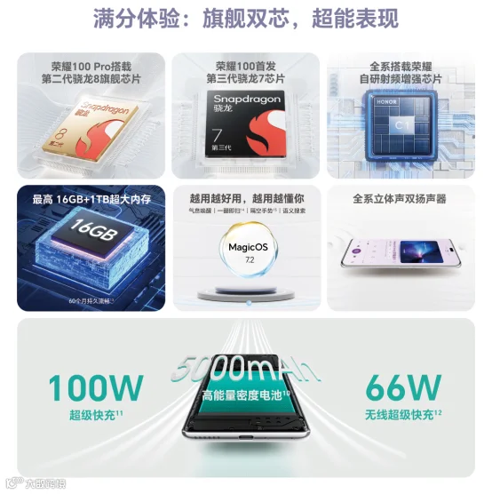 荣耀100 Pro搭载第二代骁龙8旗舰芯片,带来强悍性能;荣耀数字系列首次搭载荣耀自研射频增强芯片C1,信号流畅更快一步;5000mAh超大电池+100W超级快充和 66W无线超级快充,解锁满电体验,续航无忧;数字系列首次最高支持16GB+1T超大存储组合,大容量畅快体验。