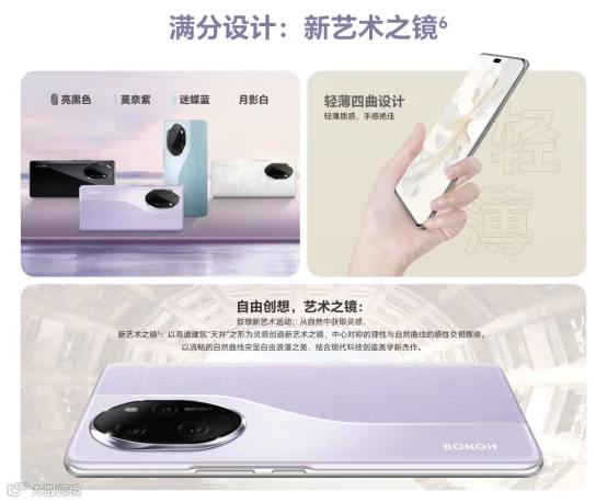 荣耀100 Pro创新带来“新艺术之镜”,灵感源自新艺术风格运用的颠峰之作一一高迪的代表建筑“米拉之家”,中心对称的天井之窗设计形态,不仅让Deco呈现出一种有机主义的艺术美感,理性几何与有机曲线的结合,更为新艺术之形创造出“自然自由主义”的浪漫之美。莫奈紫优雅浪漫、迷蝶蓝绮丽灵动、月影白皎洁高贵、亮黑色沉稳通透,感受全新色彩美学!