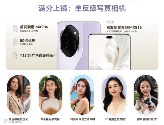 荣耀100 Pro行业首发索尼IMX906 OIS单反级写真主摄,首发前置索尼IMX816单反级写真镜头,人像写真体验升维,实现“单反级效果”。4D自然立体美妆效果,轻松驾驭不同妆容风格。OIS+EIS双防抖主摄,50倍长焦光学防抖镜头,更多影像升级等你体验。