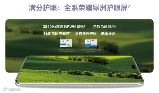 创新“荣耀绿洲护眼屏”,通过荣耀绿洲实验室测试,以3840Hz超高频PWM调光为代表,支持自然色彩显示*、360°自适应调光*、类自然护眼、助眠显示等护眼技术。手机行业首发德国莱茵TÜV全局护眼3.0认证*并通过德国莱茵TÜV无频闪双认证,代领行业迈入全天护眼新时代。