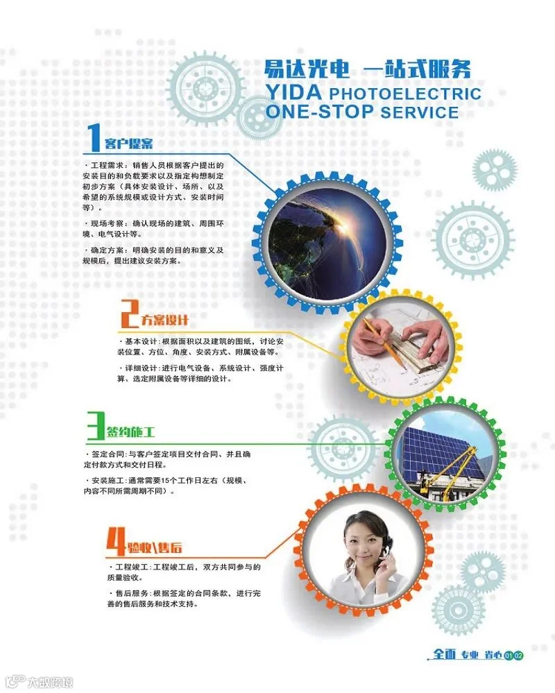 易达光电太阳能光伏发电系统易达光电太阳能光伏发电系统是一种高效、可靠的太阳能发电及能源管理系统,具有多种类型和特点,应用广泛,以下是具体介绍: