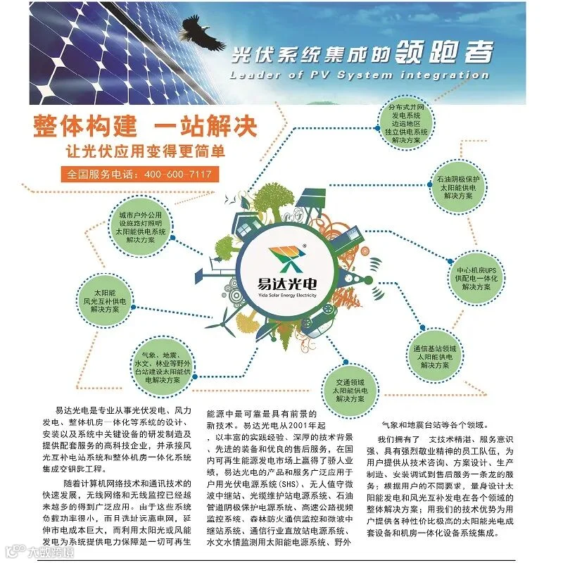 杭州易达光电有限公司专注太阳能光伏发电20多年,厂家直销太阳能发电设备,批发太阳能板,胶体电池,控制器,逆变器,光伏支架,太阳能路灯ups蓄电池,在全国东北辽吉黑西北新疆内蒙大区建立了本地化仓储运营,整体构建一站解决方案设计,快速交接。