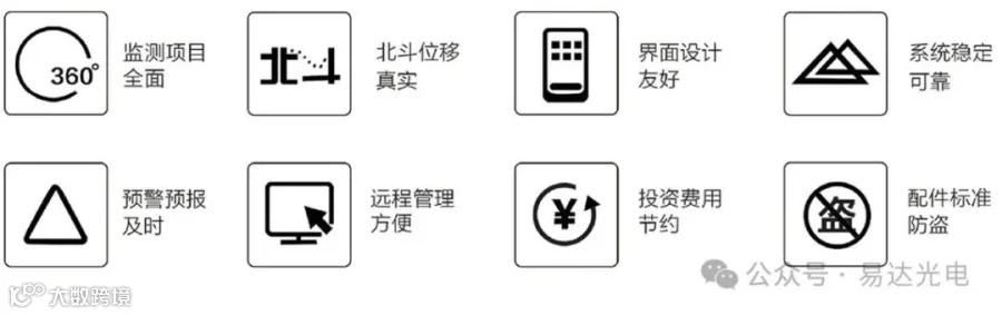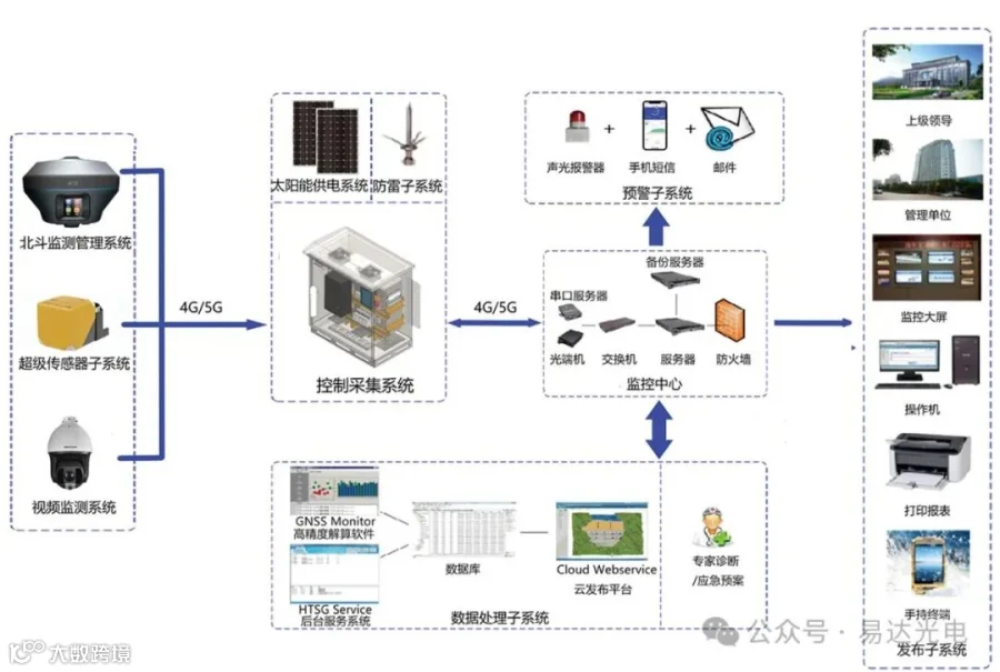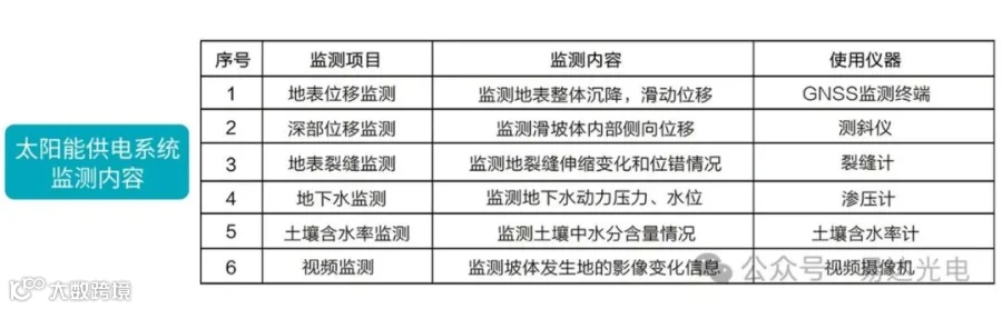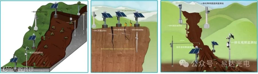 地质灾害监测预警系统的组成,主要包括GNSS、智能机器人、雨量计、裂缝计、渗压计、土压计、高清红外球机等多种设备,以及通讯模块、软件和监测云平台实现多传感器数据传输,在平台设定相应预警值后可实现预灾害报警功能。该类型灾害项目多地处位置较为偏僻,监测站点在地理位置上分布较广,建设地点与监测中心平台的距离远。利用传统的市电取电方式,不仅线路铺设成本高,施工难度大周期长,易达光电太阳能供电系统有效的解决地质地灾边坡预警系统取电难、施工难,供电不稳定等问题,对地灾监测降低投入成本,提供系统稳定性,减少资源破坏,合理利用新能源发挥更积极的意义,守护群众的生命财产安全。