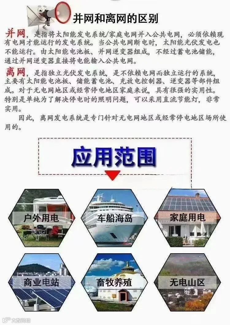 按与电力系统的关系,可以分为独立光伏发电系统(Stand-alone PV System)和并网光伏发电系统(Grid-connected PV System)。独立光伏发电系统不依赖于公共电网,能够将太阳能直接转换为电能并储存起来,适用于偏远地区或没有电网连接的地方。并网光伏发电系统则是将太阳能产生的直流电转换为交流电,然后并入公共电网。