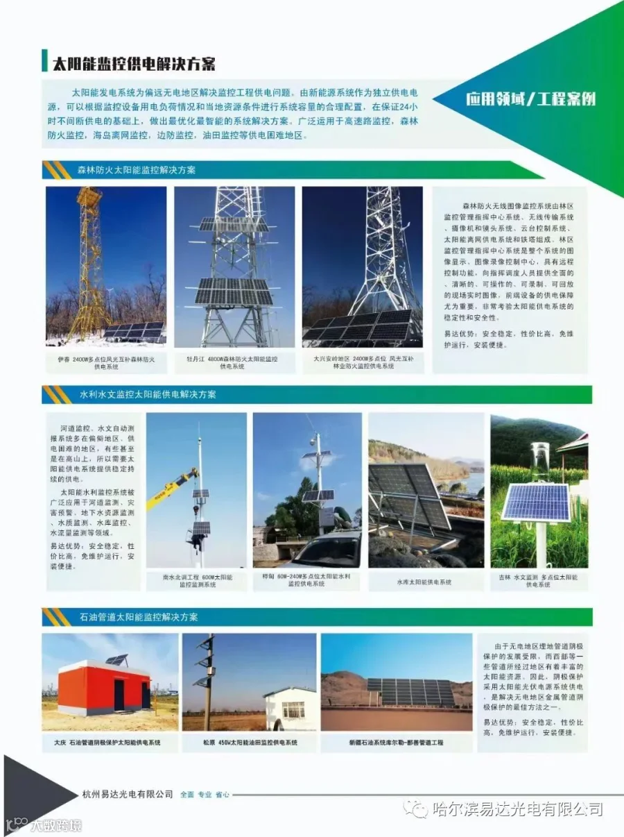 杭州易达光电有限公司专注太阳能光伏发电20多年,厂家直销太阳能发电设备,批发太阳能板,胶体电池,控制器,逆变器,光伏支架,太阳能路灯ups蓄电池,在全国东北辽吉黑西北新疆内蒙大区建立了本地化仓储运营,整体构建一站解决方案设计,快速交接。