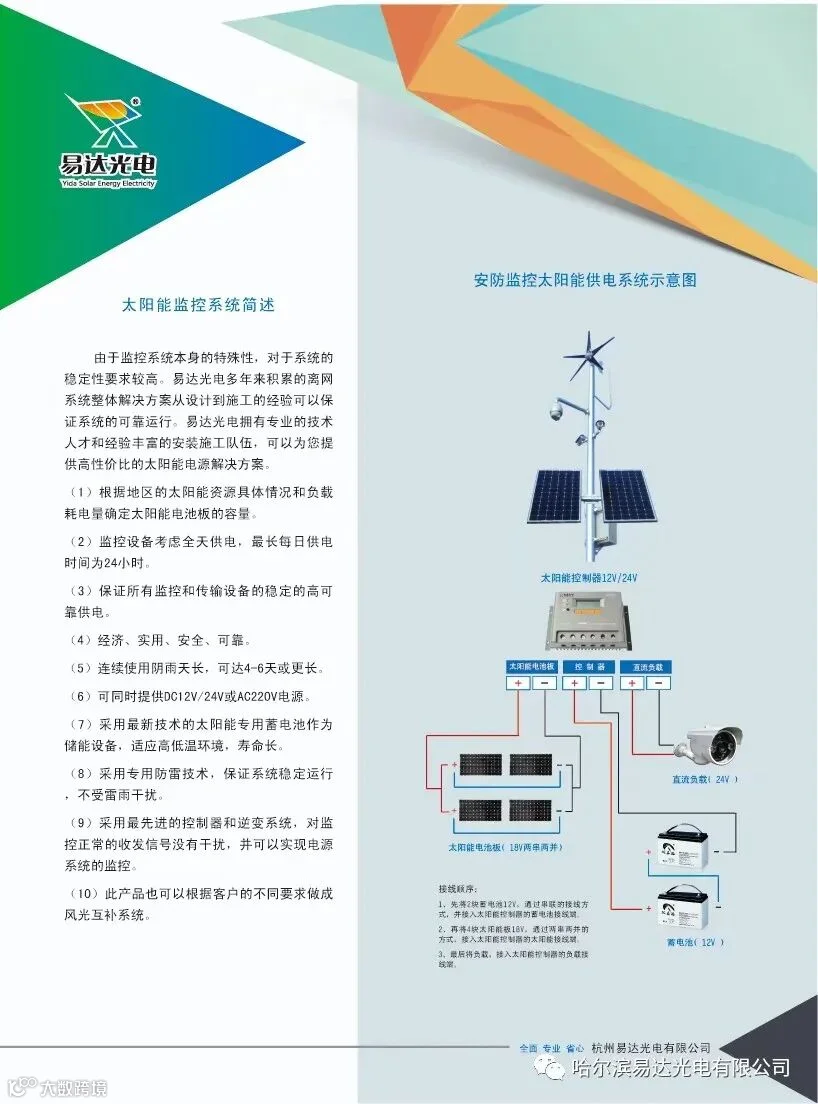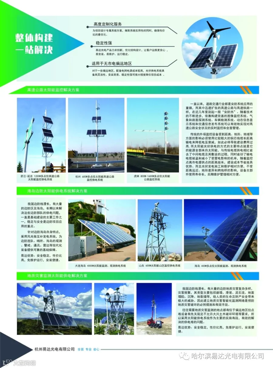 风光互补发电系统解决方案主要应用于道路照明、农业、牧业、种植、养殖业、旅游业、广告业、服务业、港口、山区、林区、铁路、石油、部队边防哨所、通讯中继站、公路和铁路信号站、地质勘探和野外考察工作站及其它用电不便地区的供电。