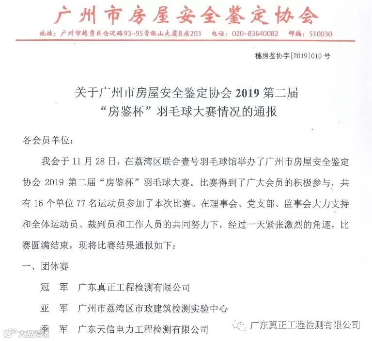 11月28日,广州市房屋安全鉴定协会在荔湾区联合壹号羽毛球馆,举办了广州市房屋安全鉴定协会2019 第二届“房鉴杯”羽毛球大赛。