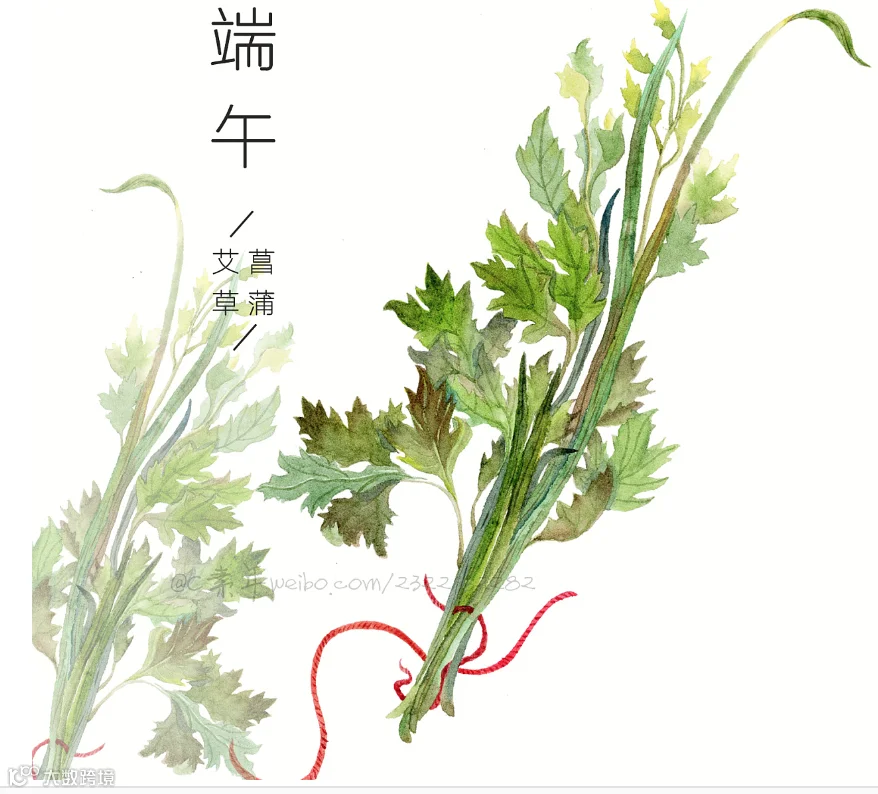 在端午节,人们把插艾草和菖蒲作为重要内容之一。菖蒲作为水生草本植物,有香气,可开窍醒神。同时,菖蒲的叶子形状似剑,民间称之为“水剑”,寓意其可“斩千邪”。正因为这两个原因,人们过端午节时,常在门前悬挂菖蒲。艾草代表招百福,是一种可以治病的药草,插在门口,可使身体健康。