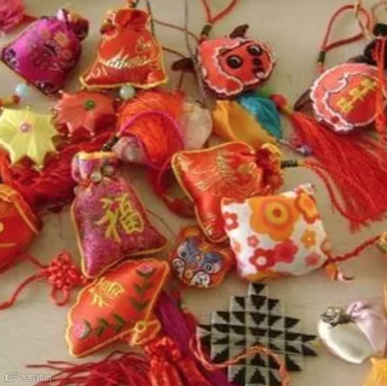 佩香囊,是端午传统习俗之一。香囊内通常填充一些具有芳香开窍的中草药,有清香、驱虫、避瘟、防病的功效。端阳以四色线系臂,并佩戴香囊,小巧玲珑精致可观。香囊又叫香袋、香包、荷包,一般是内装香料,用五色丝线缠绕而成,或者采用彩色绸缎或布块包上棉花,掺和着川芎、白芷、排草、芩草、丁香、山艾、细辛、甘松、白芷、甘草、雄黄粉等中药粉,再用彩绸扎绣而成,下边还垂上红、绿、青、蓝、紫各种线穗,佩在胸前。