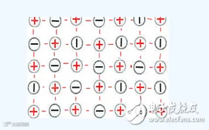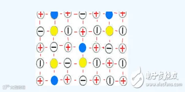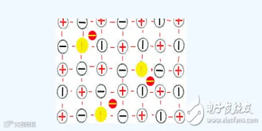 图中,正电荷表示硅原子,负电荷表示围绕在硅原子旁边的四个电子。当硅晶体中掺入其他的杂质,如硼、磷等,当掺入硼时,硅晶体中就会存在着一个空穴,它的形成可以参照下图: