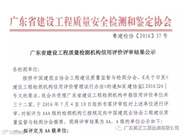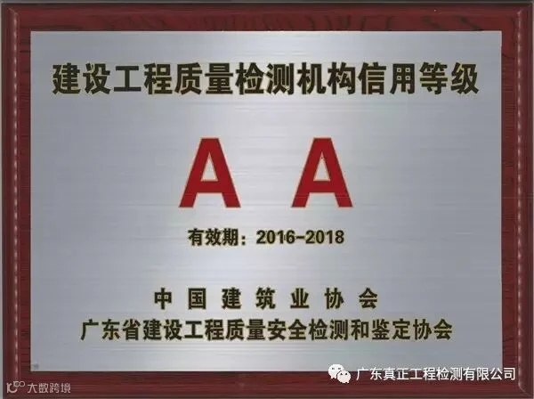 我司在中国建筑业协会工程建设质量监督与检测分会所开展的“2016年度建设工程质量检测AAA级信用机构”评审活动中,荣获AA单位。
