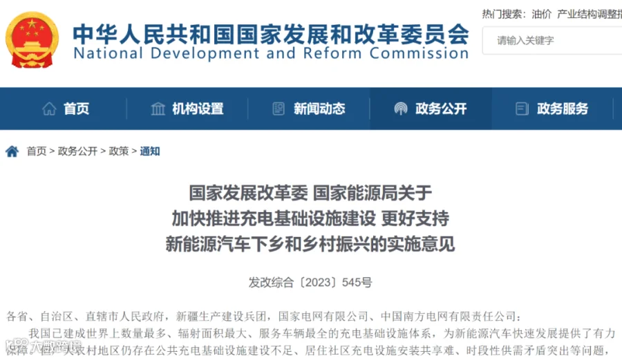 国家发展改革委 国家能源局关于加快推进充电基础设施建设 更好支持新能源汽车下乡和乡村振兴的实施意见