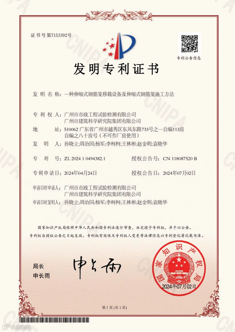 目前,该技术已授权国家发明专利2件,实用新型专利3件,成果经鉴定达到国际先进水平(粤市协科评字〔2024〕135号),对推动我国工程建设领域技术进步起到了重要的作用。