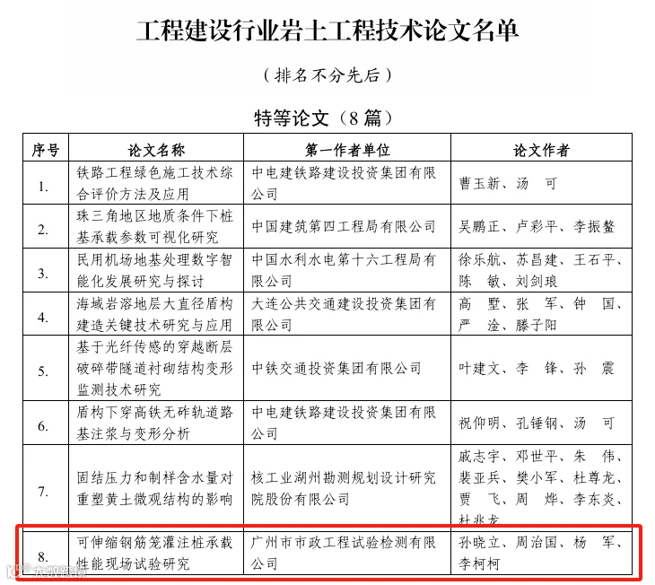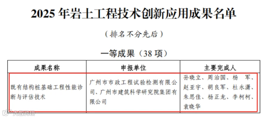 7月15日,中国施工企业管理协会正式公布2025年岩土工程技术创新应用成果名单以及2025年工程建设行业岩土工程技术论文遴选结果,广州市市政工程试验检测有限公司(以下简称“市政检测公司”)凭借自主创新研发成果,荣获特等论文和一等成果两项殊荣,充分体现了市政检测公司在岩土工程领域的前沿科技攻关能力,以创新技术和高效转化推动行业高质量发展。