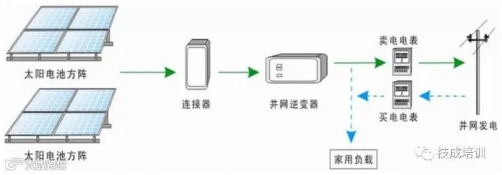 太阳能电池组件→逆变控制器→配电箱及智能电表→公共电网