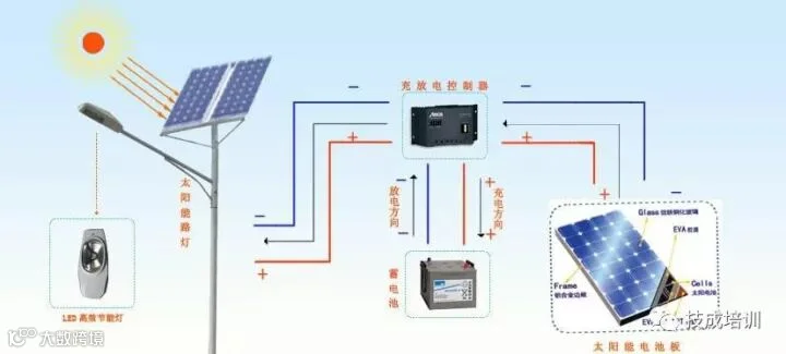 太阳能电池板→充放电控制器→蓄电池→路灯