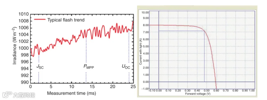 图12 (左)闪光灯测试仪高原上的典型辐照度。虚线表示典型的入射率与短路电流密度(Jsc)、最大功率点(PMPP)和开路电压(Voc)的电气测量。(右图)由闪光灯测试仪拍摄的I-V曲线。转载自KriegA (2007) Inbetriebnahmeund Weiterentwicklung eines automatisierten IV-Kennlinienmessplatzes undEntwicklung eines Verfahrens zur Materialverfolgung in derSolarzellenproduktion.硕士论文,柏林技术和经济学院[44]。