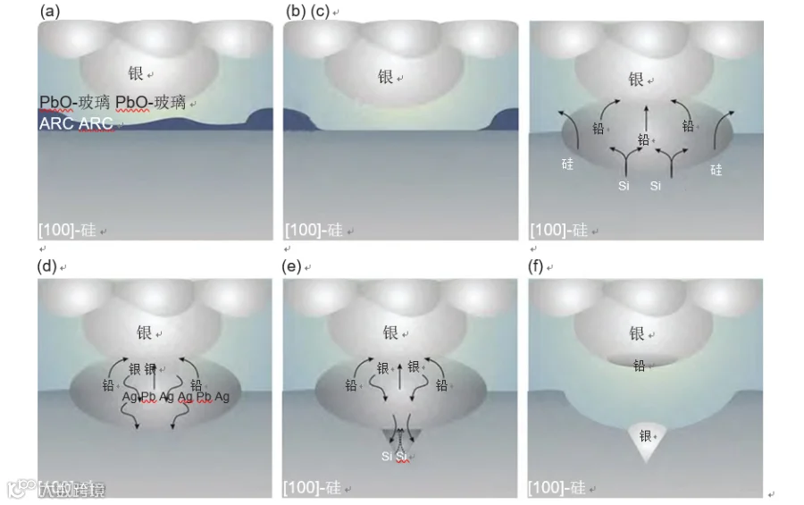 图10 接触形成的简化模型。(a) 有机物燃烧后Ag厚膜粘贴在<100>Si上的示意图截面。(b)玻璃通过SiNx层蚀刻。(c) 硅和玻璃之间的氧化还原反应。形成了Pb。(d)液体Pb开始熔化Ag。(e)Ag-Pb熔体与Si反应。形成倒置的金字塔。(f)冷却时,银在(111)-硅平面上重新结晶。经许可转载自SchubertG (2006) 晶体硅太阳能电池的厚膜金属化。康斯坦茨大学的学位论文[29]。