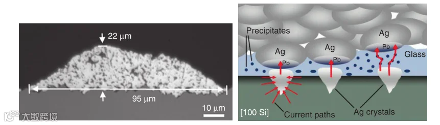 图5 (左) 电流丝网印刷接触的图片。(右)丝网印刷的银接触处的电流传输模型。提出了银晶体和银块之间三种不同的电流传输路线:直接接触,通过玻璃的隧道,以及通过玻璃中的金属沉淀物的多隧道。经许可转载自KontermannS, Hörteis M, Kasemann M, et al.(2009)退火条件下N型硅上银厚膜触点行为的物理理解。太阳能材料和太阳能电池2009(93)。1630-1635[28](版权归Elsevier公司所有)在SchubertG(2006)晶体硅太阳能电池的厚膜金属化。康斯坦茨大学的学位论文[29]。