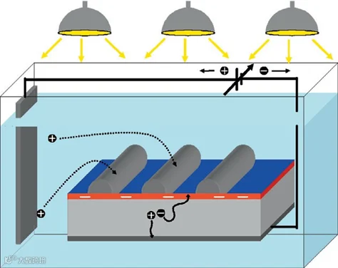 种子层的气溶胶打印[79,80]或喷墨打印[81]允许种子层的非常精细的结构,并且使用电镀步骤可以通过在其上镀金属来强制该种子层。使用光诱导电镀工艺[82-84](图17),可以使用在线电镀系统以非常高效的方式进行该工艺。这种类型的接触形成已经取得了良好的结果,各种材料和生产工具已经在工业生产线和研发环境中测试和使用。