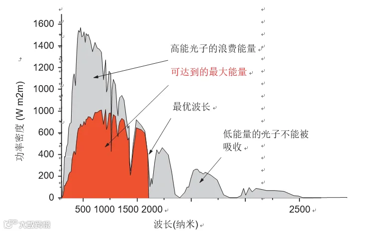 图2 太阳能电池的光谱损失。该图显示了与太阳光谱(AM1.5)有关的硅太阳能电池的最大可实现能量。