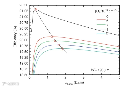 图20不同氧浓度下,效率随基底电阻率的变化。每个氧浓度的最大效率用圆表示。根据每个基底电阻率优化后触点的间距。这些点表示每条曲线效率最高的点。