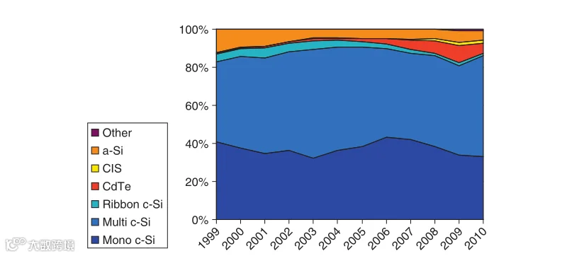 图1 不同光伏技术的市场份额。数据基于PhotonInternational上发表的年度市场调查。德国亚琛。Photon Europe。
