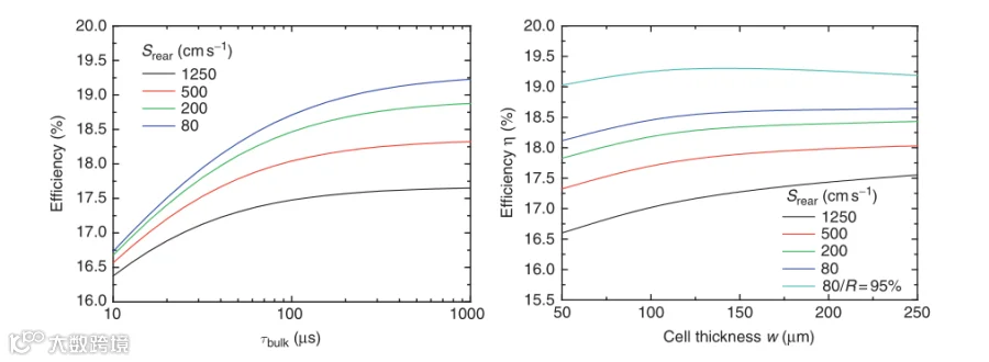 电池性能对材料质量的依赖可以通过使用更薄的晶圆来降低。因此,扩散长度/厚度的决定比随着厚度的减小而增大。这对于高效电池结构尤其有趣,因为高质量的表面结构能够在电池厚度下降时保持电池性能。例如,采用全表面钝化电池结构的mc-Si硅片在99个µm厚的硅片上的效率达到了20.4%,创世界纪录,而相同材料类型的218个µm厚的硅片[17]的效率仅为19.9%。使用高效电池结构,在小于50µm的极薄单晶晶片上,效率超过20%[113]。