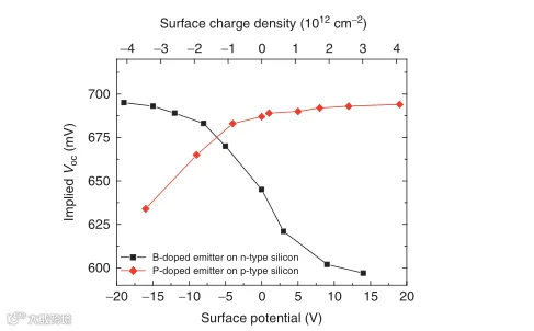 当没有施加电荷时,氧化物钝化发射体的隐含电压要比掺硼发射体的隐含电压好得多。 掺磷发射体可以通过增加正电荷导致多数载流子的积累而得到改善。同样的场效应钝化也可以通过在SiO2钝化的掺硼发射体上添加负电荷来实现。事实上,对于导致强积累的电荷,两种发射器的质量是相同的。因此,掺硼发射体的理想表面钝化应该有一个强大的负电荷。