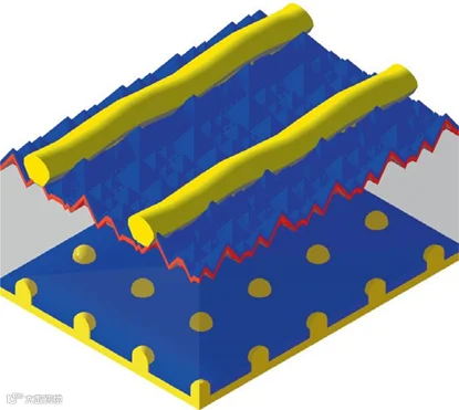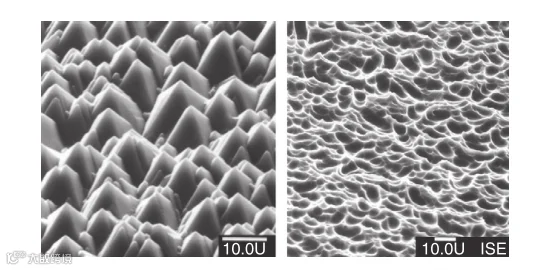 2. 太阳能电池的正面(在本文中,正面是指太阳能电池面向太阳的一面)是有纹理的,纹理深度通常为几微米。单晶硅的特点是直立的随机分布的金字塔,而多晶硅太阳能电池的表面主要是随机分布的圆型山谷(比较图4)。纹理的主要功能是增加进入硅吸收器的光子的传输,并增加光子在吸收器内的路径长度(相对于表面的光子传播的斜向和表面的高内部反射)。