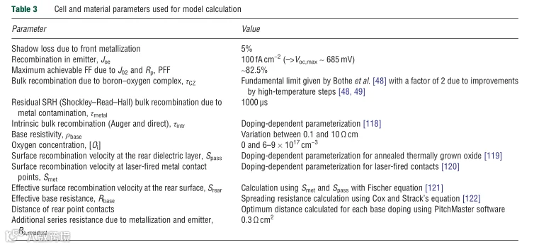 对于后表面结构,我们选择了激光点火触点(lfc)和退火热生长氧化物的组合,因为这样可以产生非常高的效率,而且表面复合速度的掺杂相关参数化是已知的[119,120]。由于技术原因,即沉积温度较低,选择Al2O3作为后表面钝化层可能更好。然而,它不会显著改变我们的计算结果,因为从最近的出版物