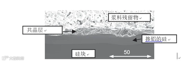 Schubert[29]的模型中描述了正面接触的形成过程。在烧制过程中,浆料中含有的玻璃蚀刻了电介质层,并与底层硅直接接触。然后,液态玻璃促进银颗粒中的银和硅溶解到这个液相中,以及金属玻璃颗粒溶解到银颗粒中。硅的溶解优先沿着硅内强结合的(111)平面出现,形成特殊形状的晶体[28]。