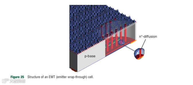与前几节所述的MWT太阳能电池相比,发射器贯穿式(EWT)太阳能电池概念包括完全禁止正面金属化(由Gee等人首次提出)。[184]).这是通过用一组密集放置的小直径(约50微米)的通孔(约每平方毫米的电池面积有一个通孔)来取代前面的接触结构。晶片的后表面和通孔具有进一步的发射器结构,通过通孔与前表面的发射器连接。在EWT概念中,只有位于后表面的发射器被金属化。后面的发射器是以有规律的、相当密集的(间距约为2毫米)模式中断的,以便暴露出单元的基础,形成接触。这样就可以形成一个相互交错的金属网,从而实现有效的电流传输(图25)。