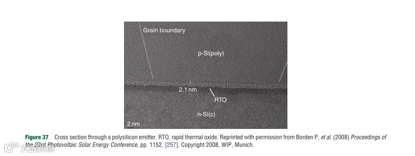 人们也可以不使用非晶硅,而是沉积掺杂的多晶硅[254-256]。这样做的好处是多晶硅的吸收率更低,温度稳定性更高。为了获得最好的结果,使用一个薄的中间电介质层来钝化界面并阻止多晶硅发射极的扩散,从而形成一个非常突然的结(图37)是有利的。使用现代微电子设备和薄的快速热氧化物(RTO)作为界面层,重新审视了这个概念[257]。用这种有希望的方法,开路电压已达到678 mV。