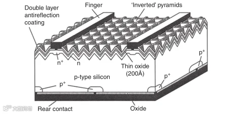 图23 PERL(钝化发射极,后部局部扩散电池)太阳能电池结构。经赵等人许可转载。(1990)太阳能材料与太阳能电池41-42:87 - 89。[139]。版权1990爱思唯尔。