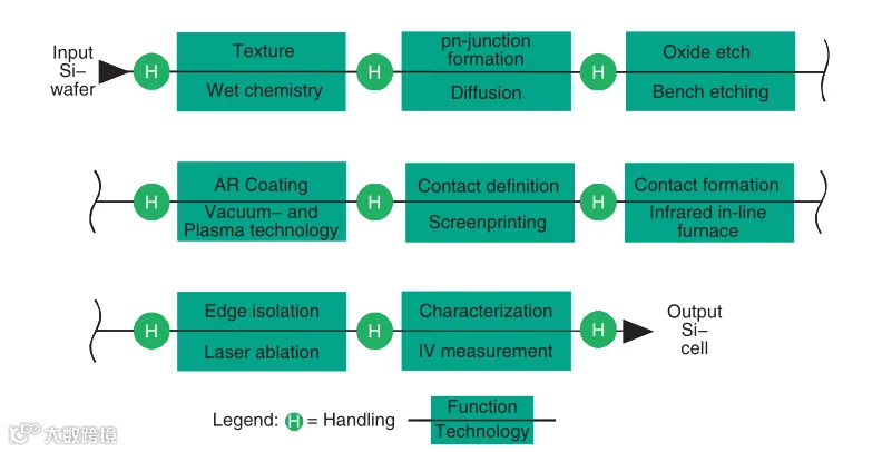 入口界面是堆栈中的硅片。作为第一步,硅片通常使用红外透射来检查微裂缝。然后,根据进一步加工是批量加工还是在线加工,它们或者被分拣到湿化学载体中,或者直接被放到传送带上进行进一步加工。